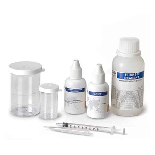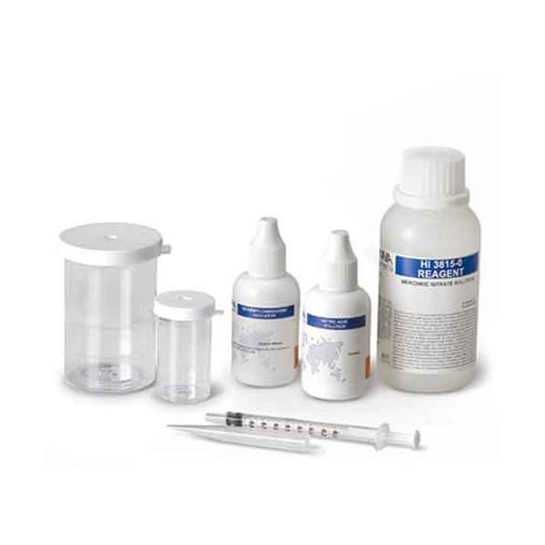 The HANNA chloride test kit is quick, easy to use and portable. The design makes the kit easy to handle and, except for mercuric nitrate solution, practically prevents accidental injury or damage due to spills. The pH is lowered to approximately 3 by addition of nitric acid. Mercuric ions react with chloride ions to form mercuric chloride; when excess mercuric ions is present, it complexes with diphenylcarbazone to form a purple solution. The color change from yellow to purple determines the end point of this titration.