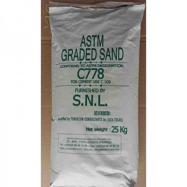 Graded sand is made of natural silica sand (silica content 99 %), having a water content lower than 0.1 %. The constituent grains of this sand are uncrushed and of rounded form. It is packaged in bags of 25 kg. The sand is used for testing of hydraulic cement strength conforming to ASTM C 109.