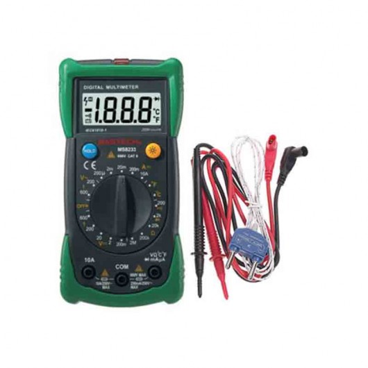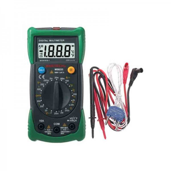 The Mastech MS8233B is a manual 19-range fully featured digital multimeter. It is capable of all standard functions including AC/DC voltage and DC current, resistance, diode check & continuity test. It has a back-lit LCD display with a maximum reading of 1,999.It has a built-in non-contact AC voltage detector that will detect any AC voltage greater than 90V and send out flash warning.