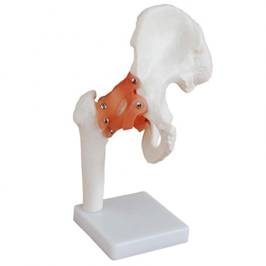 Demonstrate abduction, ante version, retro version, and internal / external rotation. Include flexible, artificial ligaments. Life-size, on stand. Size: 21x19x28CM.