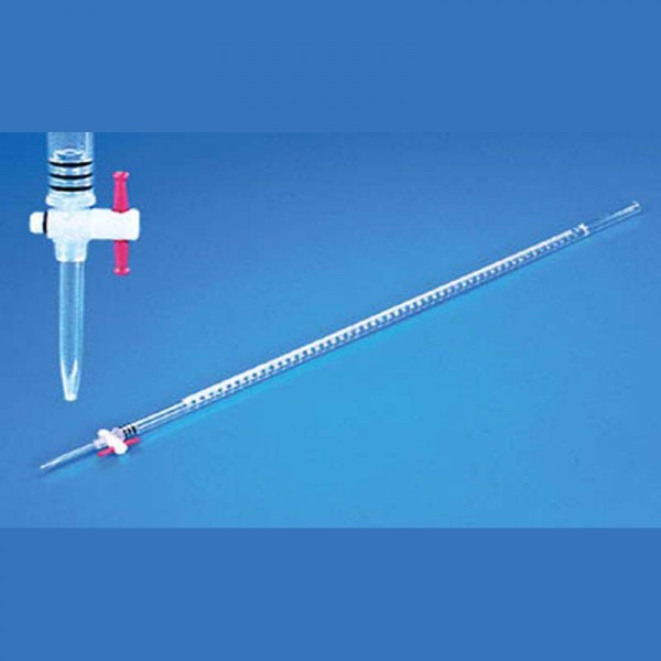 This burette has a transparent acrylic body and a leakproof stopcock fitted with a self-lubricating PTFE plug. Each burette is individually calibrated to give maximum accuracy. Acrylic body is unaffected by dilute mineral acids and bases except hydrofloric acid and ammonium hydroxide. The pH range of 1-14 is ideal and can be used up to 5% wt/wt of acids or 30% bases.