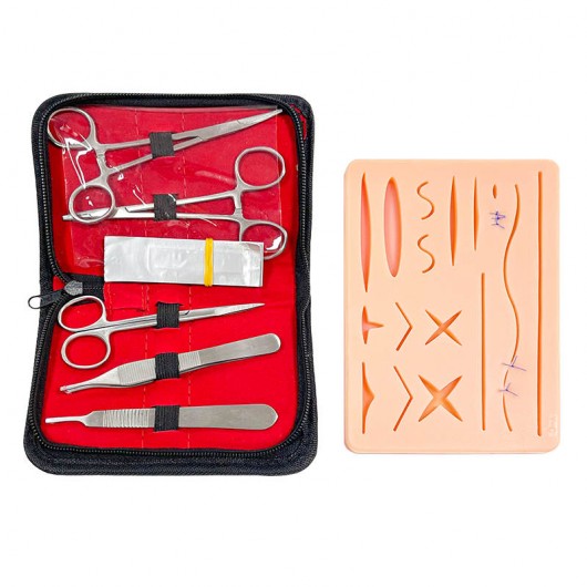 Includes a durable silicone suture pad, instruments and carrying case.